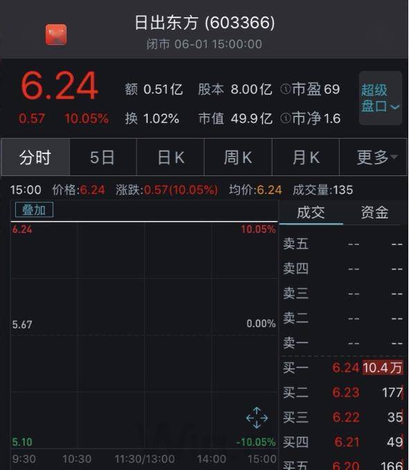 受上述消息影响,概念股日出东方今天一字涨停,市值增长了4.51亿元。