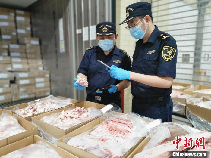 广州海关所属南沙海关关员对转运入库冻品进行审核登记 殷寿柏 摄中新网广州6月1日电 (唐贵江 关悦)据广州海关1日消息,广州海关在广州南沙口岸创新推出货物跨监管区域定向流转物流监控新模式,有效解决冻品进口企业“一仓难求”而部分冷库仓储企业闲置难题,保障南沙冷链产业稳定发展。相关举措拉动前4月南沙口岸进口冻肉7.9万吨,同比增长1.4倍。