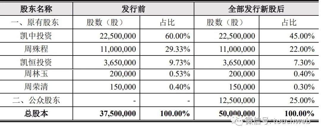 IPO前,凯迪股份的实际控制人周殊程、周荣清、周林玉在发行前直接、间接控制公司100%的股份,发行后周殊程、周荣清、周林玉直接、间接控制公司的股权比例仍将达到75%。