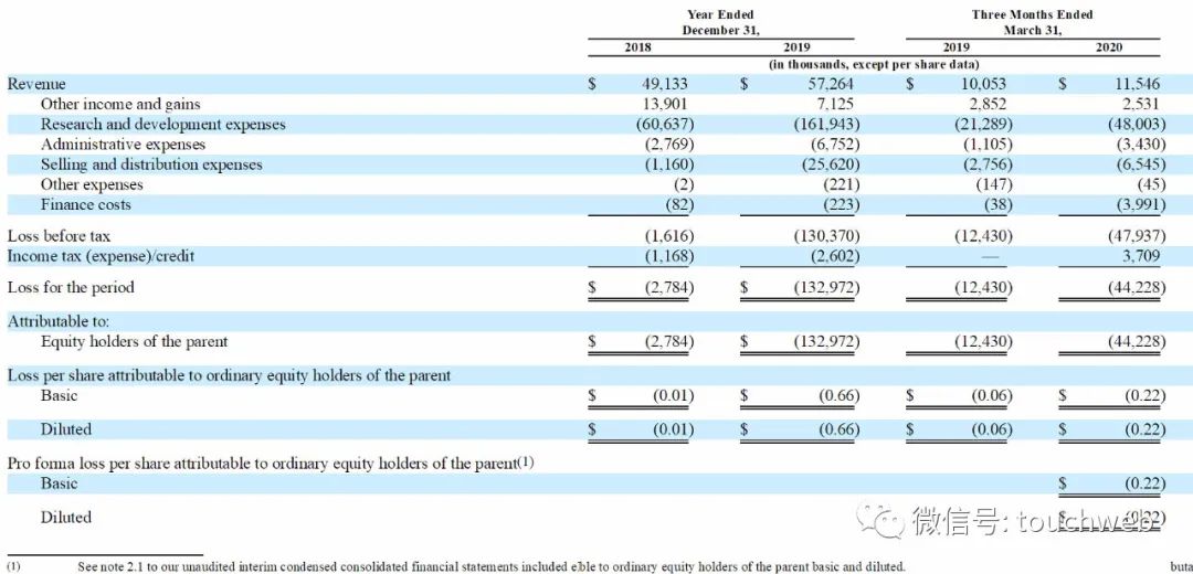 传奇生物在2018年、2019年营收分别为4913万美元、5726万美元;运营亏损分别为278万美元、1.33亿美元;