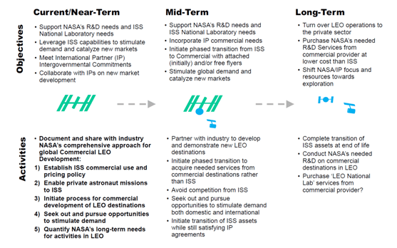 为了在长远上解决国际空间站退役后,美国宇航员在近地轨道长期驻留的问题。NASA将促进企业对近地轨道飞行目的地的投入和研发。近期,NASA将开放国际空间站上的接口,资助企业研发商业舱段安装到国际空间站上来。而NASA作为启动用户,将会订购相当的服务。最终,NASA希望这些舱段,乃至未来的近地轨道商业空间站,都能由包括NASA在内的许多用户共用,而非NASA一家独享。