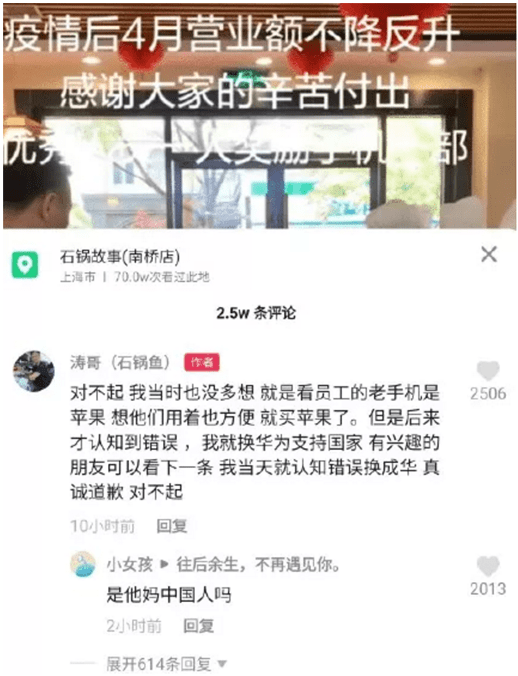 高飞锐思想爱华为,自觉抵制苹果,但不赞成网友这种群情激奋的表现,当然也觉得包括饭店老板在内的行为值得商榷。网友爱国情怀下的批评建议弥足珍贵,有助于凝心聚力,统一认识,但宜温和理性,让人心悦诚服地接受;如果诅咒就有失理性和风度,效果适得其反了。饭店老板的作法,在全国声讨美国极限打压华为的特殊时期,确实有逆潮流而动之嫌,适当批评或提醒一下,也不是不可以。