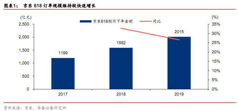 由华泰证券图表所示,2019年618活动期间的下单金额达到了2015亿元,同比2018年的1592亿元,增长了26.6%。对比今年618,是后疫情时代的首个全民购物节和史上最有意义的一次京东618,今年预计将延续高增长,带动旺季行情。