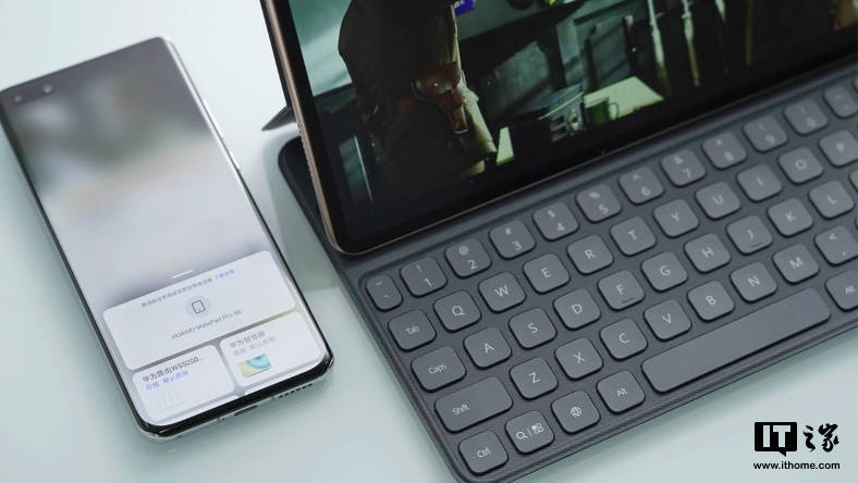 例如在手机中用华为视频播放院线新片,只需碰一下键盘的Shift键,就会出现“任务接续”,我们就可以把手机上播放的视频直接“投”在平板上。这不同于投屏,手机退出或关闭视频软件也不会影响华为MatePad Pro 5G上的视频播放。
