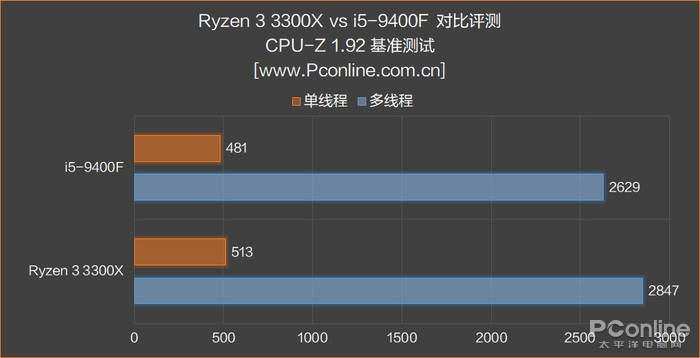 作为一款AMD三代锐龙处理器,锐龙3 3300X的单核频率并不算低,而且比i5-9400F还高,理所当然的前者单核性能会超过后者。