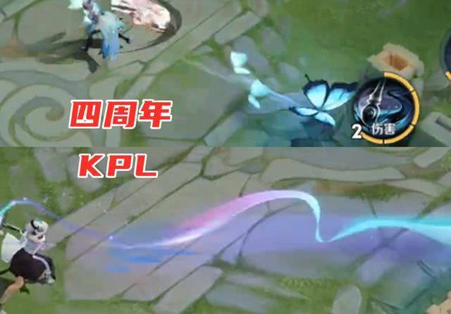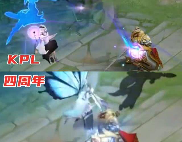 首先是普攻的特效对比,在四周年的皮肤特效中,主要的元素是蝴蝶和水墨风,因此在普攻释放后也是一次蝴蝶的快速飞出,其中优于KPL一点的在于,蝴蝶的特效飞行轨迹很清晰,但是KPL的特效是一条曲折的光影,会有一定的视觉限制,因此单拿这点来说,算是四周年的好一些。