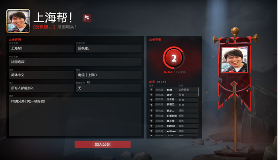 而820所创立的“上海帮!”公会则与湖南帮总舵形成了遥相呼应之势。有着传奇队长之称的820使用了YYF的经典表情包作为公会旗帜,一句“反枫建”足以道尽该公会中心主旨。