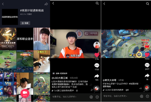 LGD大鹅江城在抖音发起的#光羽计划进阶挑战#,引来百万粉丝抖音达人 @寒天大帅哥 率先应战,随后数百名民间大神在线Battle!话题总播放量达403.4万次。