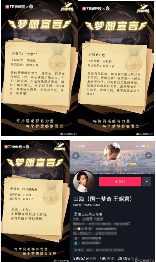如此亮眼的数据,足以说明玩家们对此次计划的期待与支持。刀锋电竞官方也分享了部分报名玩家的梦想宣言与故事,热血的、感人的、霸气的……甚至还有粉丝百万的抖音大神,可以看出这些“小羽毛”们,都有着一腔热血,斗志满满。这个证明自己的机会,他们等了太久。