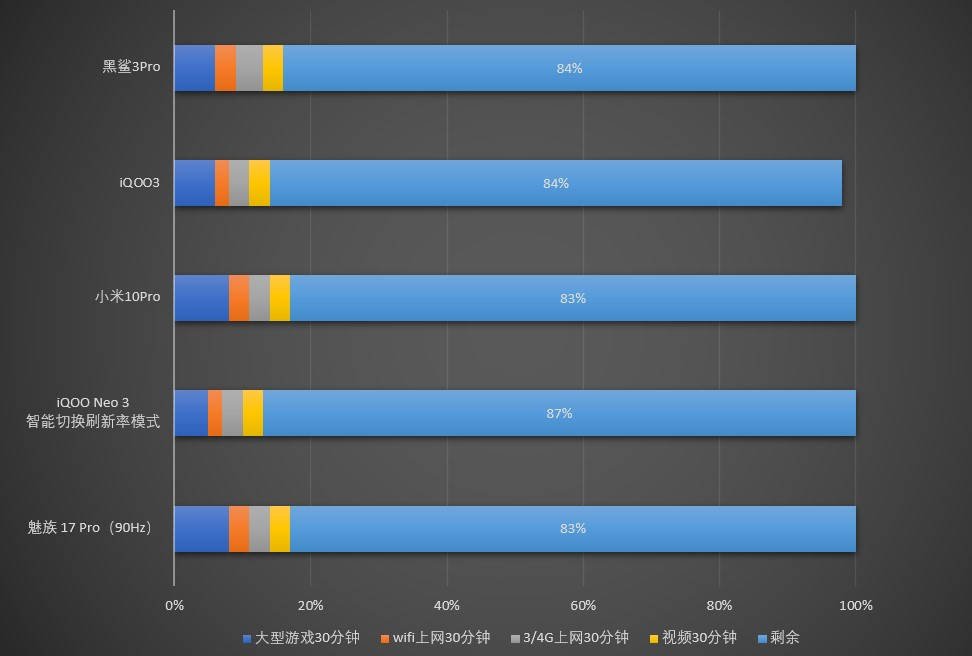 魅族 17 Pro 内置了 4500mAh 的电池,搭配 Flyme 去年以来做得相对不错的省电优化,预期续航表现不会差。在爱搞机的 2 小时续航测试中,开启 90Hz 刷新率的魅族 17 Pro 剩余电量 83%,与小米 10 Pro 成绩相当。而反映到日常使用中,从早上出门到晚上回家,中度使用一天一充完全没有问题。