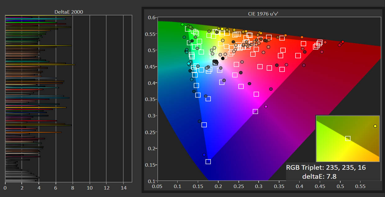 鲜艳模式,色温 7070K,覆盖 105.3% P3 色域,P3 平均 deltaE 3.1