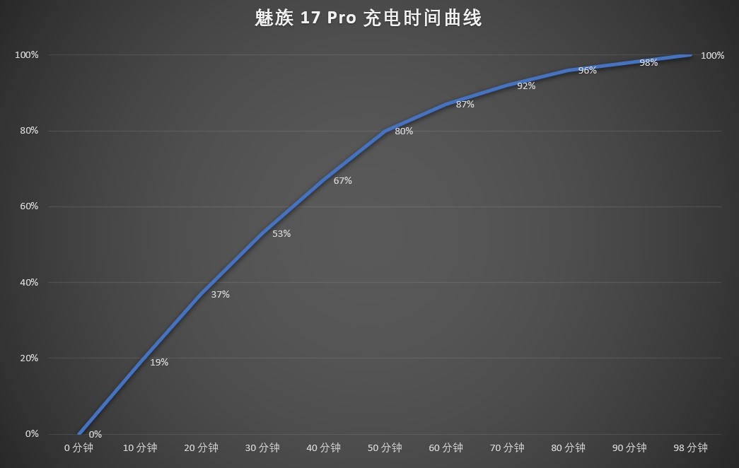 充电方面,魅族 17 Pro 此次终于将有线快充由万年 24W PE 升级为全新的 30W 规格,实测从零电量开始充电,1 小时可充至 87%,完全充满耗时 1 小时 38 分钟,后期涓流充电时间较长。这一成绩在如今的旗舰机当中只能算比较一般,甚至也比不上今年的中端机型,后续的产品想要达到在 1 小时以内充满的主流水准,魅族还得往上提升快充规格才行。