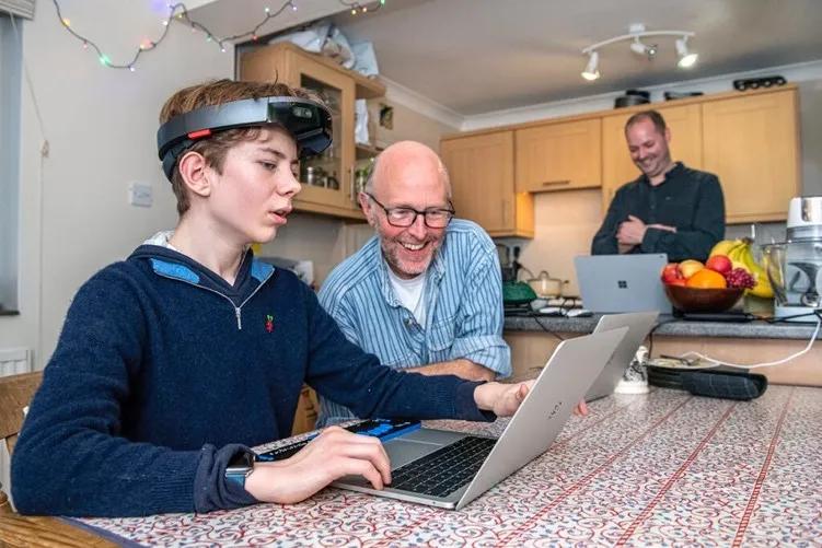 12岁的失明男孩 Theo 坐在厨房的一张桌子旁。他戴着微软 HoloLens 左右转动头部,摄像机、深度传感器和扬声器环绕着他的沙棕色头发。