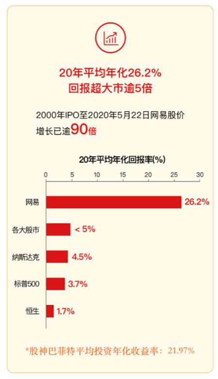 纳斯达克上市20年,据估算,上市20年来,网易股价增长超过90倍,回报超大市逾5倍,算入派发股息的持股整体年化回报高达26.2%。另外,自2014年起,网易已连续6年每个季度为股东分红,是为数不多按季分红的中概股,展现出强大的经济实力和财务自信。