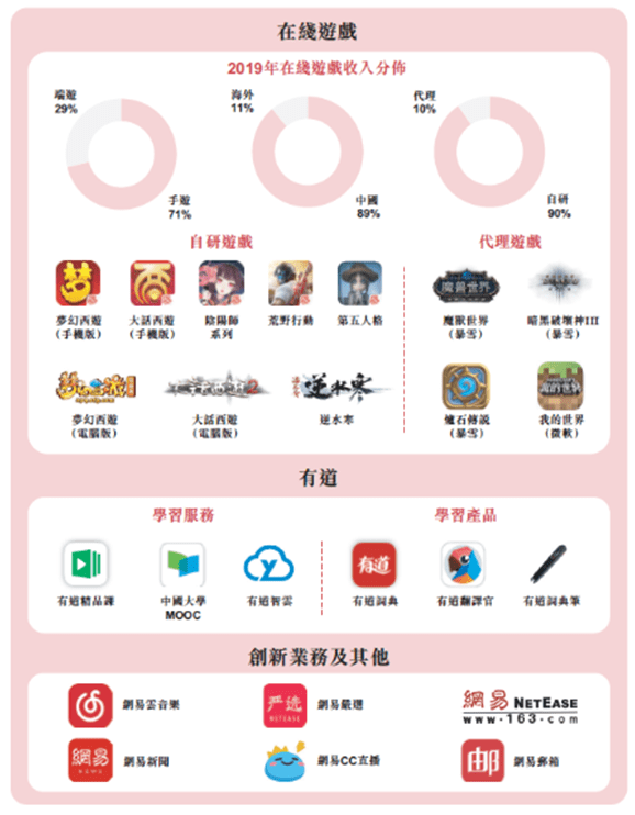 其中,全球化战略及机遇主要包括三方面:第一,继续通过丰富海外市场(如日本、美国)的在线游戏内容并增强我们的全球研发及游戏设计能力改善网易在全球的影响力;第二,继续通过投资于国际游戏开发商、IP及内容所有者以及与其合作以探索全球的机遇;第三,致力在海外市场发展网易的智能学习及其他创新业务。