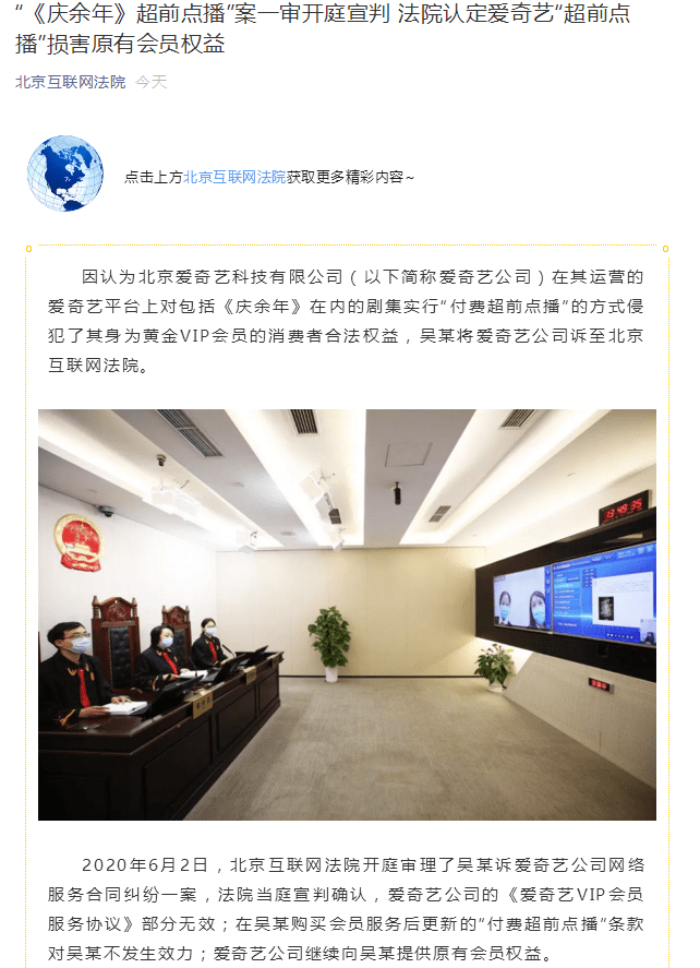 6月2日,“《庆余年》超前点播”案在北京互联网法院开庭宣判。法院当庭宣判确认,爱奇艺公司的《爱奇艺VIP会员服务协议》部分无效;在吴某购买会员服务后更新的“付费超前点播”条款对吴某不发生效力;爱奇艺公司继续向吴某提供原有会员权益。
