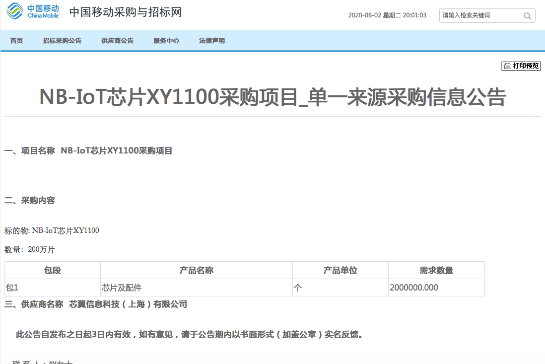 公告显示,该采购为单一来源采购,共采购200万片NB-IoT芯片XY1100,采购人/招标代理机构为中移物联网有限公司/中招国际招标有限公司,供应商为芯翼信息科技(上海)有限公司。