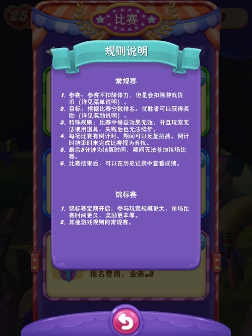 公平是任何竞技游戏的第一要素,在《糖果缤纷乐》之中比赛模式会让玩家的增益无效化,并且不能使用任何道具,失败后也无法继续游戏,绝对保证竞技的百分百公正。在规则上参赛的选手也不会扣除你的体力,只要你有足够的金条就可以在比赛模式之中反复畅玩打出自己想要的成绩。报名的金条数由1到3依次排列,参与玩家越多的赛事金条奖励越多,同理你所需要花费的报名费用也越多。除此之外游戏中还有定期开启的锦标赛,锦标赛的规模将是常规赛的数倍,奖励也丰富数倍。