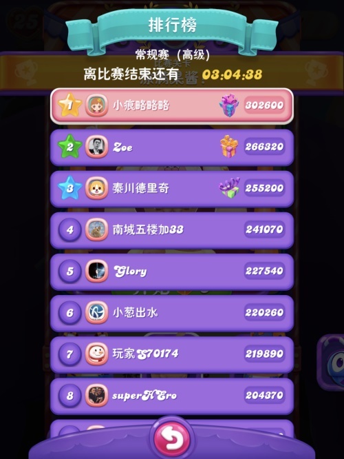 在比赛模式之中排行榜的变化时间一般在1到3个小时,按照报名的金条数决定,也就是说在这段时间之内你都有机会打出非常优秀的成绩。如果未能在一场游戏之中成功消除,你的得分是不计入排行榜的,简单的讲成功消除是基础,之后才需要考虑如何获得更高的消除积分。积分获取规则上比赛模式和普通玩法相同,尽量多的使用特殊糖果消除组合将是你的得分的最佳途径。自然对于排行榜人人都有着一颗力争第一的野心,第一名所获得的金条可是报名费用的五倍,相信这将是对冠军最好的嘉奖!