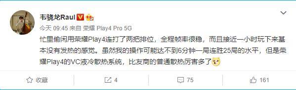 与此同时,荣耀Play系列产品经理韦骁龙也在其个人微博中表示:忙里偷闲用荣耀Play4连打了两把排位,全程帧率很稳,而且接近一小时玩下来基本没有发热的感觉。虽然我的操作可能达不到6分钟一局连胜25局的水平,但是荣耀Play4的VC液冷散热系统,比友商的普通散热厉害多了。这无疑是在暗示荣耀Play4在游戏方面有着出色的底层优化,游戏运行十分流畅;而对于这种高负载所产生的高发热量,荣耀Play4也能凭借VC液冷散热将热量快速导出,持续让硬件输出高性能。