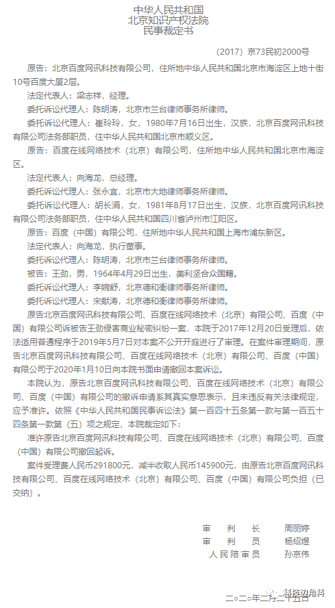 百度公司等与前高管王劲侵害商业秘密纠纷案日前出现新进展。天眼查披露的资料显示,2020年2月25日,北京知识产权法院批准百度公司撤诉王劲请求,仍需负担案件受理费14.59万元。