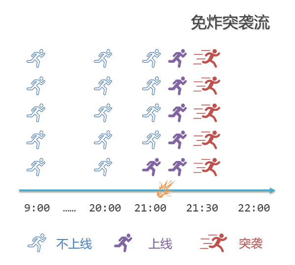正所谓光脚不怕穿鞋的,对于突袭党而言,全队在21点前基本不会上线,此时战队等级为0,对炸弹完美豁免。等到21点整,先让一位队员上线抢炸弹,一旦引爆其他队员就能安全上线,然后获取PK助力链接,安排冲锋事宜。较瘦姑且称之为 “免炸突袭流”,图示如下。