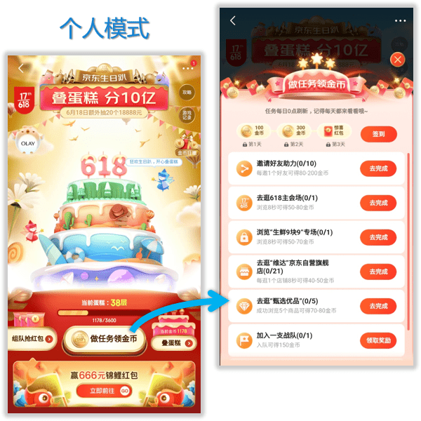 5月21日至6月20日,京东推出618重磅活动 「叠蛋糕」,总奖池高达10亿元,此活动分为个人模式与团队模式,两种玩法互为补充。目前游戏已迈入第二阶段,火爆的团队PK正式开战!