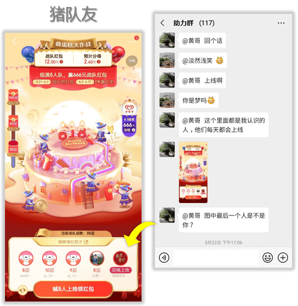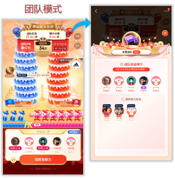 组队PK+重度助力,每天组队参与PK挑战,队员拉助力攒蛋糕,总层级较高者赢得本场战队红包,6月18日方可兑现战队红包。