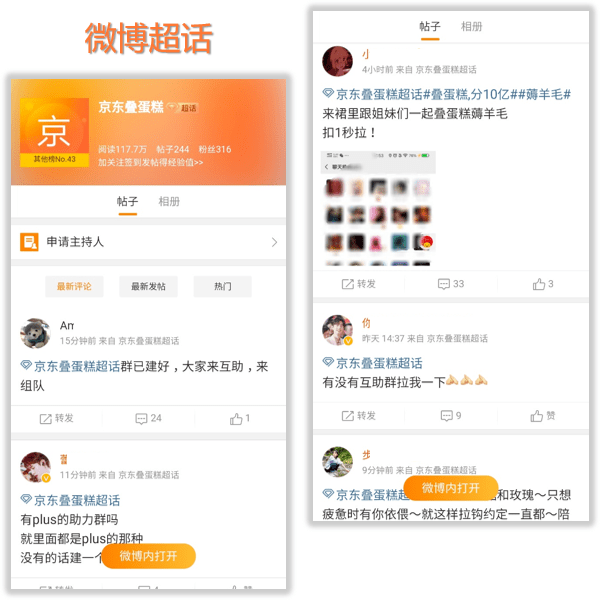 微信或QQ上的助力群,多多益善有备无患。如果圈子窄找不到群,不妨微博搜索 “京东叠蛋糕”,在相关超话里能遇到志同道合的羊毛友,甚至助力群。