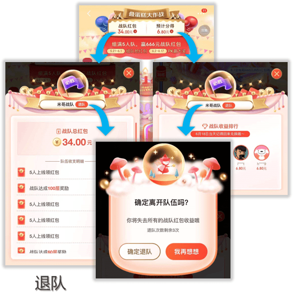 需要注意的是,在组队PK阶段,退队时间窗口为晚上23:00至次日7:00,而且退队者前期累积的预计分得红包将清零,正所谓,组队需谨慎,退队徒伤悲!