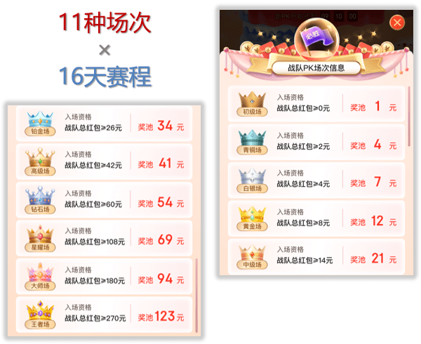 从6月2日至6月17日,每天9点将根据战队总红包匹配相应场次,并扣除门票后加入PK战,当天22点PK结束,按照两队的蛋糕总层级定胜负。