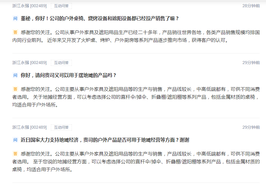 新京报讯 6月3日,地摊经济大火之下,浙江永强在深交所互动易上回复相关问题称,公司主要从事户外家具及遮阳用品等生产与销售,产品线较长,中高低端都有,可供不同消费者选用。关于地摊经营方面,可以考虑选择公司的直杆伞/掉伞、折叠棚/遮阳棚等系列产品,包括金属材质的桌椅,均适合用于户外场所。