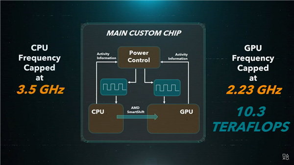 PS5集成了八个CPU核心并支持同步多线程,主频3.5GHz,且会根据实际情况自主调节,同时集成36个GPU计算单元、2304个流处理器,频率2.23GHz(同样可变),浮点性能10.28TFlops(每秒10.28万亿次浮点)。