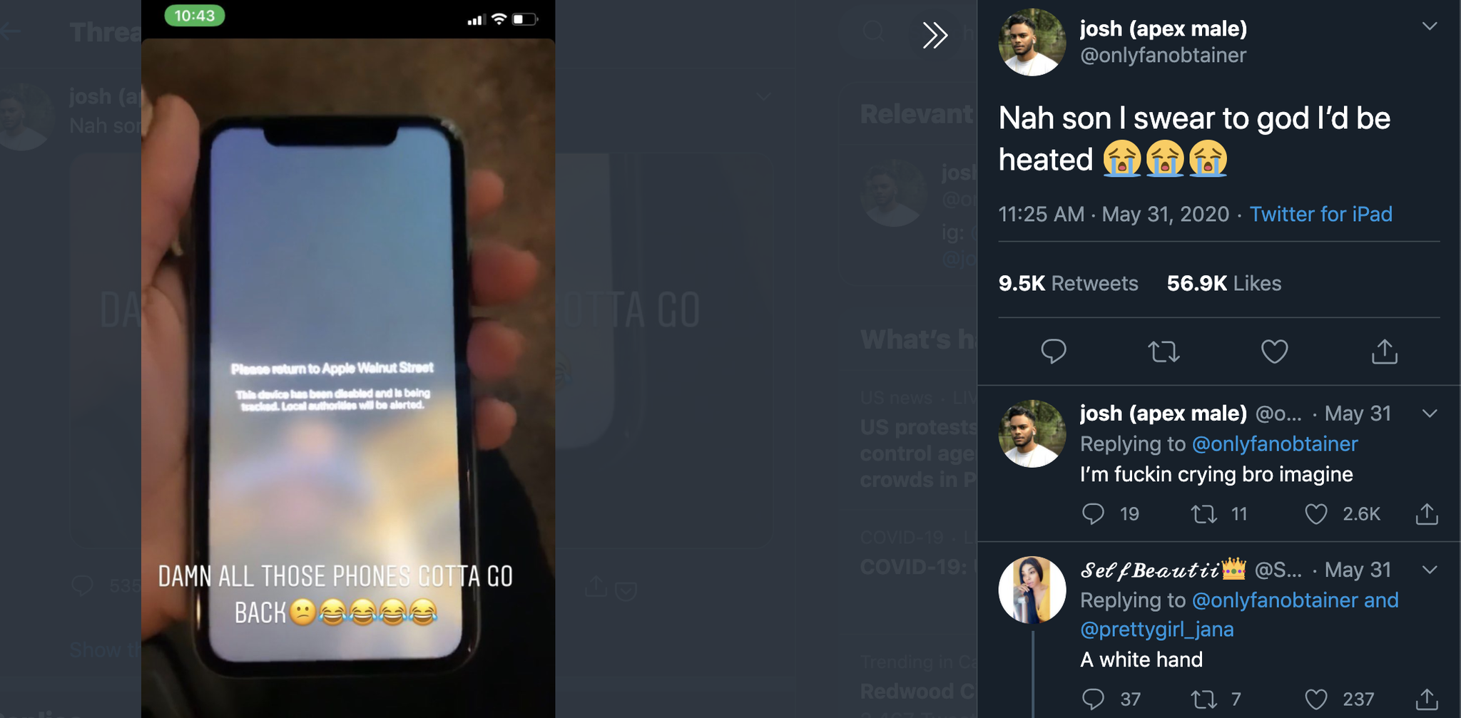 一位用户在5月31日在推特上“主动曝光”,发布了他手中iPhone的照片,iPhone上显示:“请还回苹果Walnut Street门店,这台设备已经被禁用并追踪,并将通知当地警方。”