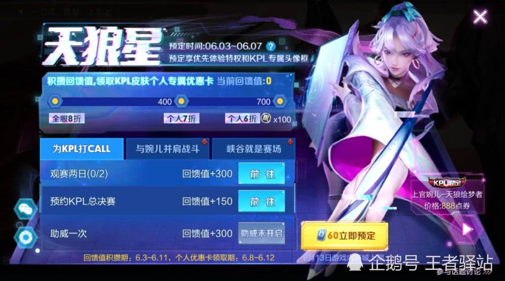 2.虽说同样消耗60点券预定抢先体验皮肤并领取专属相框,但解锁个人专属折扣需要玩家积攒回馈值(攒够700回馈值解锁6折)。