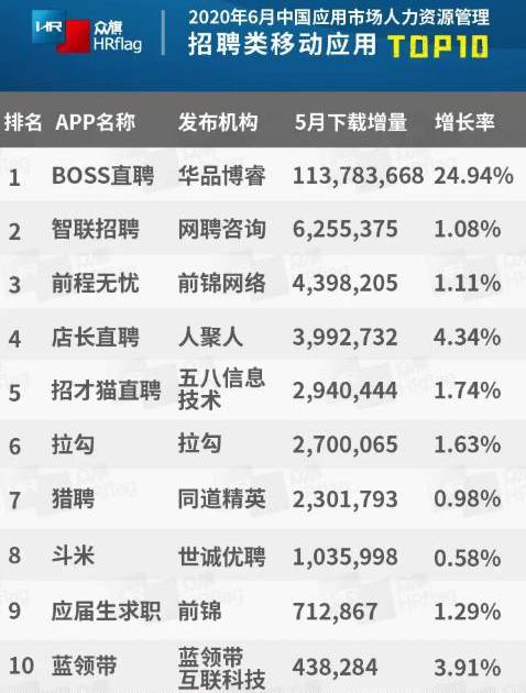 中国专业人力资源智库HRflag昨日发布了2020年6月中国招聘类移动应用排名。结果显示,BOSS直聘实现了增量和增速的“双料第一”。其中,1.13亿的下载增量一骑绝尘,是智联招聘的18倍,是前程无忧的26倍。在增长率上,BOSS直聘高达24.94%的增速,是前十名中唯一一家达到两位数增速的平台,增速远超脉脉、领英、智联招聘等一众知名应用。
