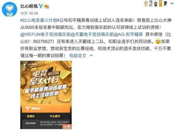 有10位比心大神入选WEFUN线上试训,20位比心大神入选AG线上试训,10位比心大神入选Tianba线上试训。如果线上试训表现优异将有机会正式晋升职业战队。