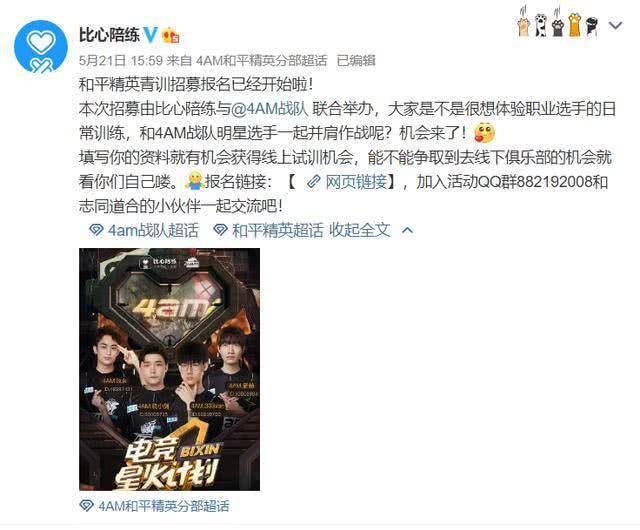 比心陪练是国内领先的游戏陪练平台,拥有3000多万用户、300多万陪练大神。作为Wefun、Tianba、Ag等顶级战队的赞助商,比心陪练多次联合战队举办青训选拔赛。本月和平精英4AM战队的青训线上选拔也会在比心陪练上如期进行。