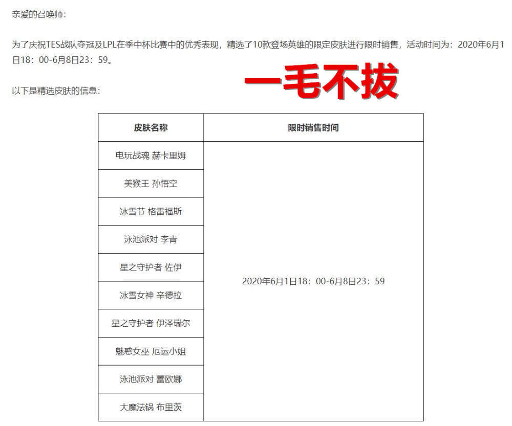 要知道各个赛区就数LPL限定皮肤最多,许多皮肤在外服根本不是限定,到了LPL就变成了限定。而且最为主要的是,限定皮肤回归竟然是原价……所以此次TES夺冠约等于没有活动。