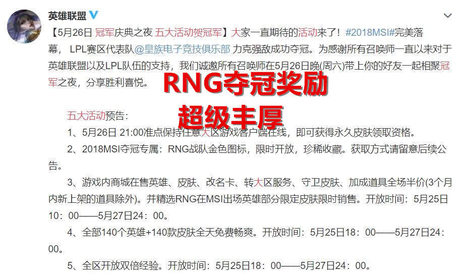 RNG在S8:玩家们登录可得一个皮肤、全场半价、LOL全部英雄和一定皮肤全开放、全区双倍经验