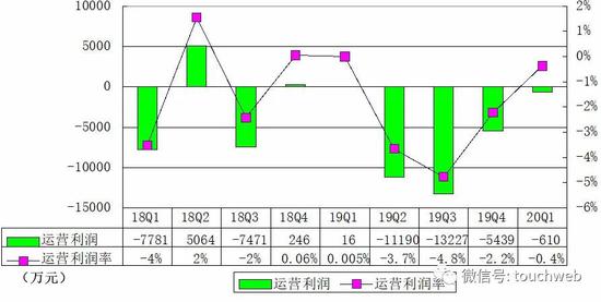 云集2020年第一季运营亏损为610万元,运营利润率为-0.4%,上年同期运营利润为16万元。