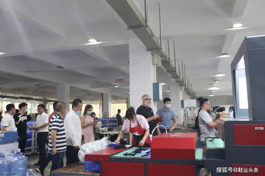 剪彩仪式过后,金商羽总经理亲自带领到场嘉宾前往合作品牌工厂参观。在意大利FILA代工厂铭诚体育用品有限公司和李宁品牌代工厂红晟鞋业有限公司的生产车间里,大家共同参观了德尔科技自主研发和生产的全自动智能画线机。它稳定、精准、高效和简单的操作方式让现场嘉宾纷纷鼓掌和争相拍照。