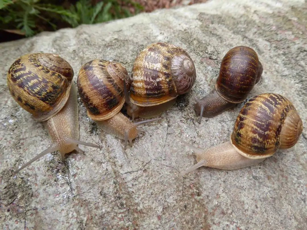 研究中的左旋蜗牛,右二为杰里米,其余四只来自西班牙的一家养殖场。图片来源:University of Nottingham