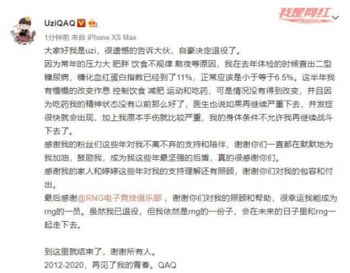 UZI官宣原文首先表示自己要退役了,然后还讲了一些有关退役的理由,比如说压力太大了,还要经常熬夜,自己也过于肥胖,这都对自己的身体非常不健康,现在精神状态也不是很好,如果继续待下去的话,将会有很多并发症的,所以为了身体原因不得不停止战斗了,UZI还感谢了粉丝们,朋友们,家人们以及RNG俱乐部的支持和照顾,当然他也表示虽然自己退役了,但是仍旧是RNG的一份子。