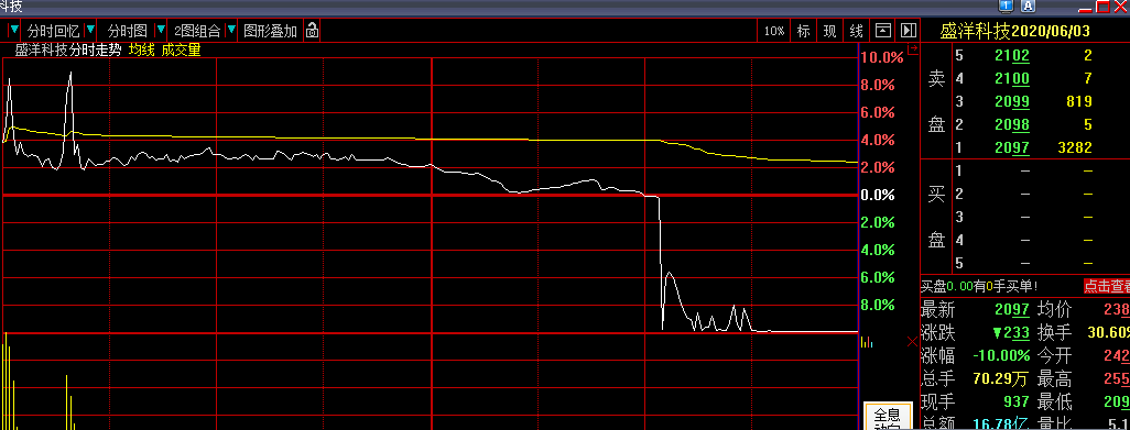 今日开盘,盛洋科技继续被20多万手封单封死跌停,也就是说如果从昨天的最高点买进话,今天就已经亏了30%。