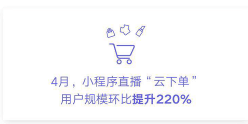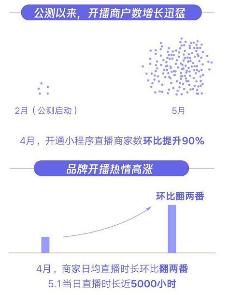 5月21日公布的最新数据显示,公测启动至今,小程序直播开通商户增长迅猛,4月份开通小程序直播商家数量环比提升90%,日均直播时长环比翻两番,5月1日当天直播时长近5000小时,被分享次数最高的直播间可达20万次;4月小程序直播“云下单”用户规模环比提升220%。