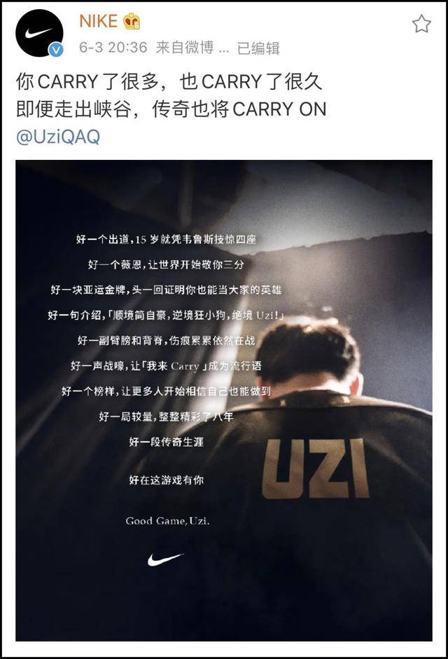 Nike 官博也在 Uzi 宣布退役后,发文向这位代言人表达最高敬意。