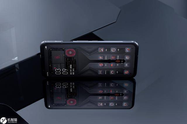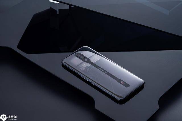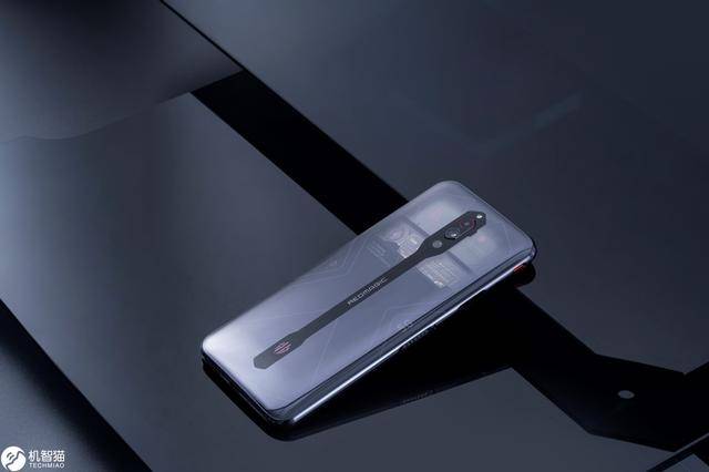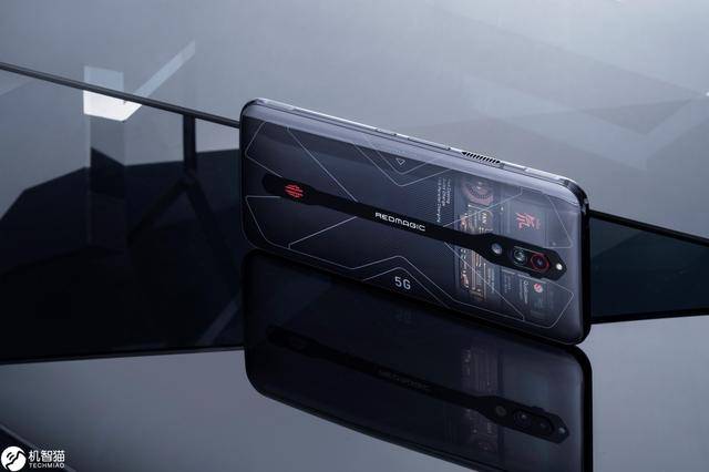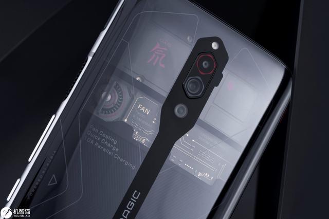 先看一下他们这次的工艺和外观,背面玻璃从下到上有一个透明到不透明的过渡,原本赛博朋克风格的涂装也继续保留,为了看起来不杂乱,线条更简洁,中间的RED MAGIC呼吸灯带也保持了一致性,在风扇转动的时候,可以设置灯带亮起,感觉更酷炫。