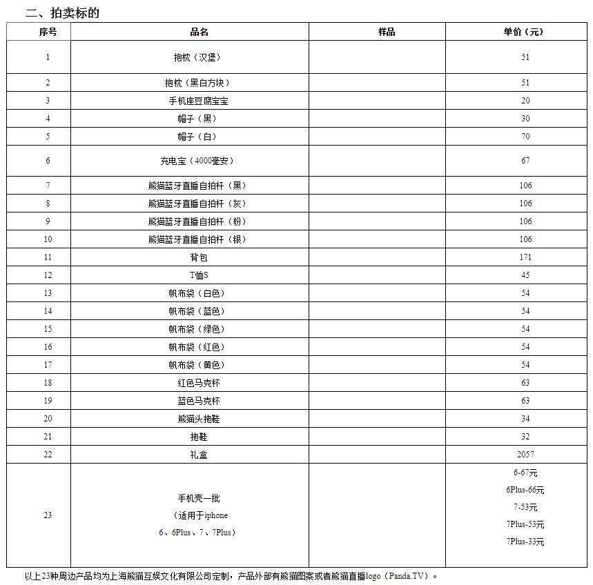 竞买公告显示,此次拍卖标的包括抱枕、帽子、充电宝、自拍杆、背包、马克杯、手机壳等多种周边产品。管理人将多件产品进行搭配销售,并给每一组产品分别命名。