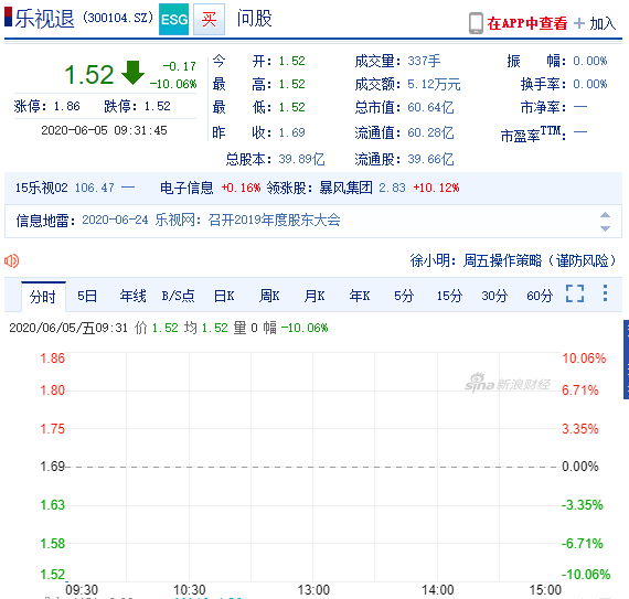 6月5日上午消息,乐视网今日开盘跌停,股价报1.52元。